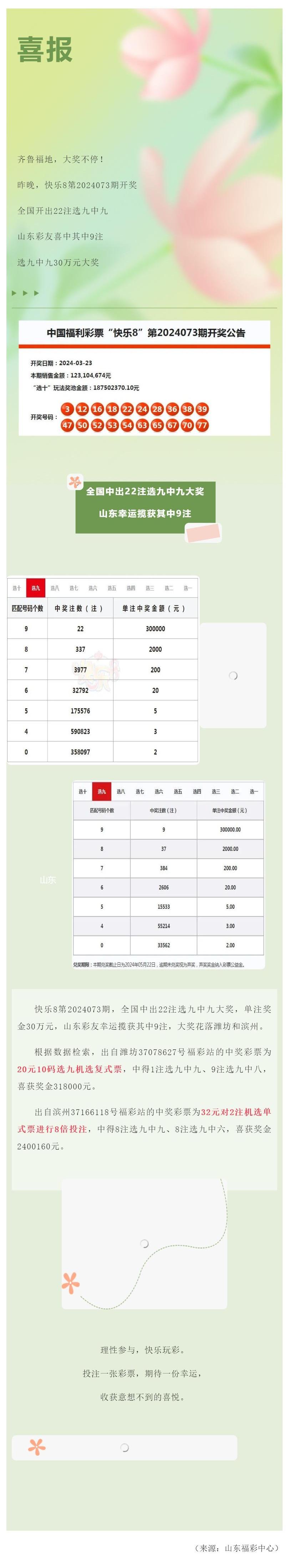 山東攬獲9注快樂(lè)8選九中九30萬(wàn)元大獎(jiǎng)!