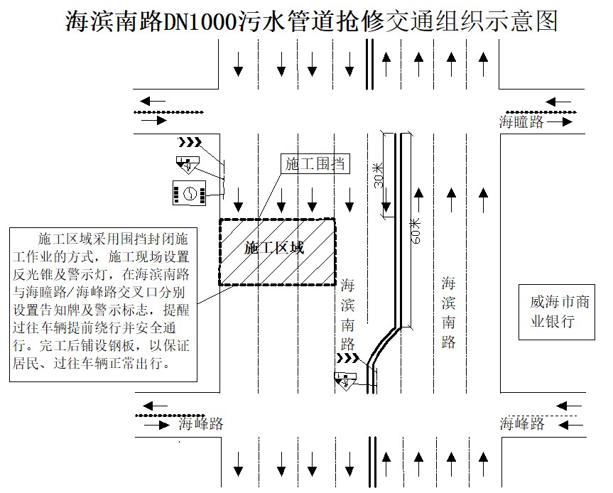 因海濱南路(海瞳路口向南40米)污水管道故障,經(jīng)相關(guān)部門批準,水務(wù)集團于10月29日開始對該處管道進行維修,為確保工程順利實施及施工期間的交通安全,現(xiàn)公告如下: