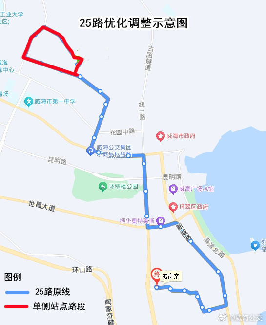 威高花園樞紐站改為途經(jīng)站,調(diào)整后,25路改為戚家夼環(huán)行運行,由戚家夼發(fā)車,按原線運行至威高時光城站點后,改行宮松嶺路、遠(yuǎn)遙墩路、臥龍山路、宮松嶺路按原線路返回戚家夼站點。威高花園區(qū)域站點調(diào)整為單側(cè)???。