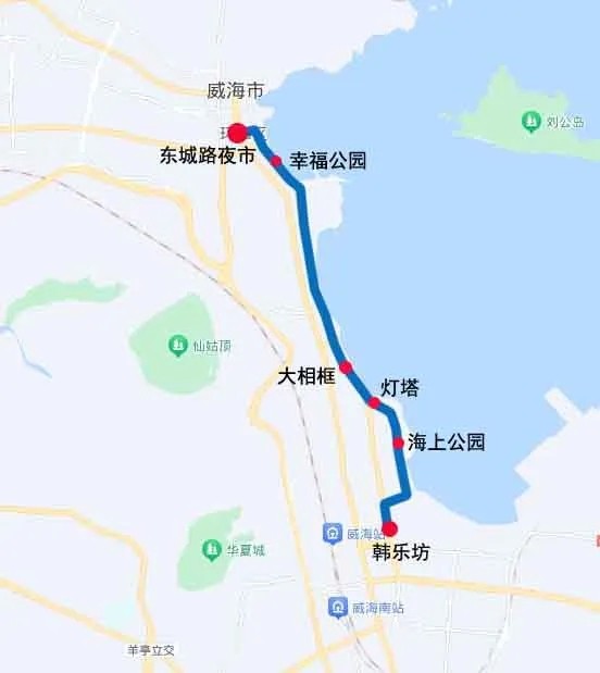 線路由東城路夜市發(fā)車,途經(jīng)大相框(市人社局東)、燈塔、海上公園(慶威花園)、韓樂(lè)坊東(經(jīng)區(qū)中國(guó)銀行)、韓樂(lè)坊(紅星美凱龍)、海上公園(慶威花園)、燈塔、大相框(市人社局東)、幸福公園后返回東城路夜市。