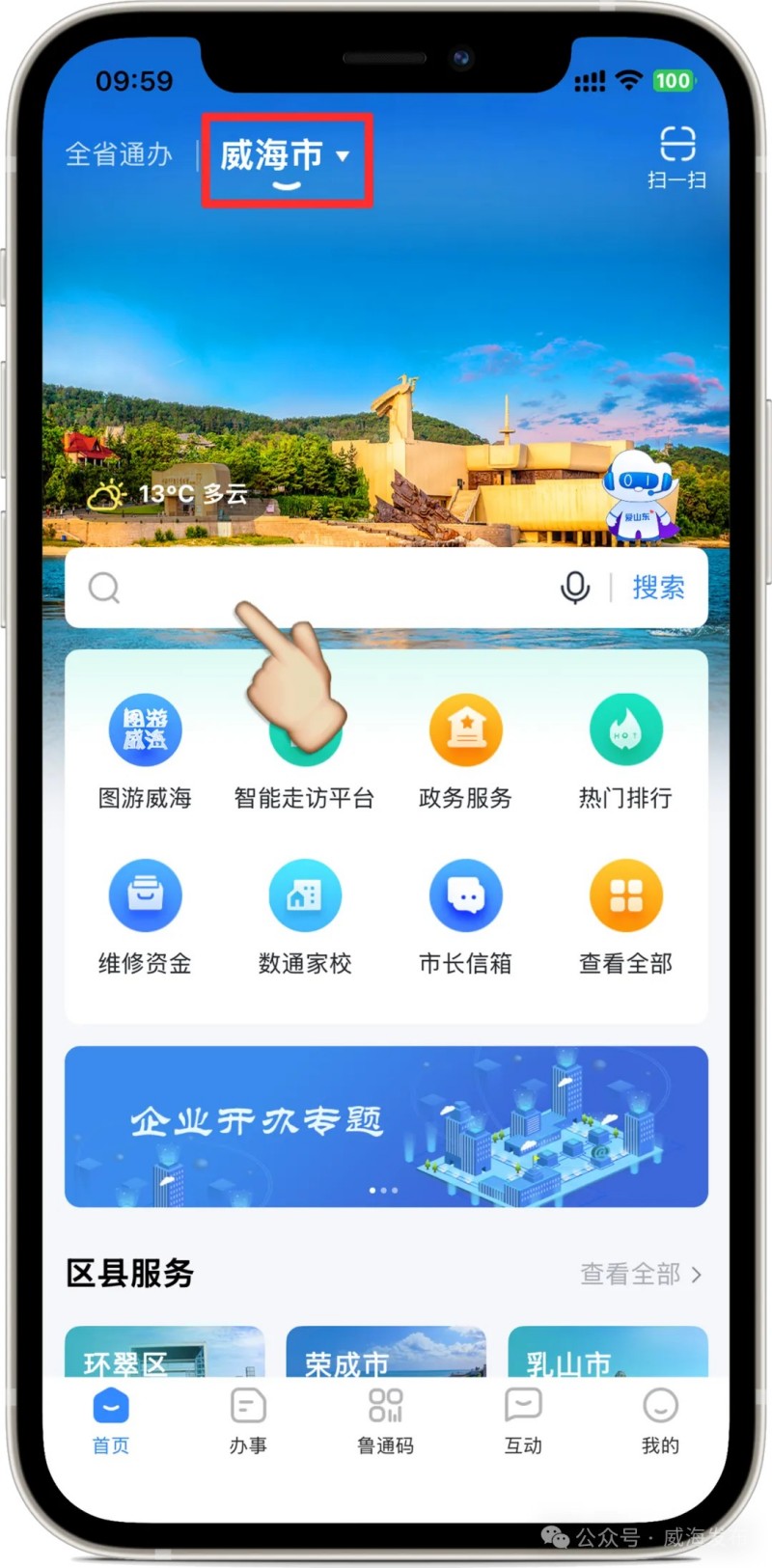 進(jìn)入“愛山東”APP后,在首頁左上角選擇進(jìn)入“威海市”,在搜索框搜索關(guān)鍵詞“銀行營業(yè)網(wǎng)點(diǎn)”,點(diǎn)擊進(jìn)入應(yīng)用。