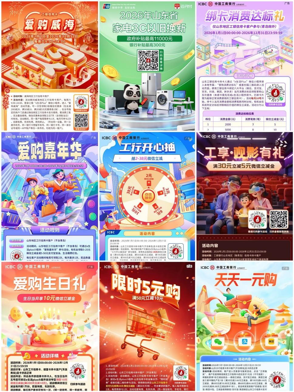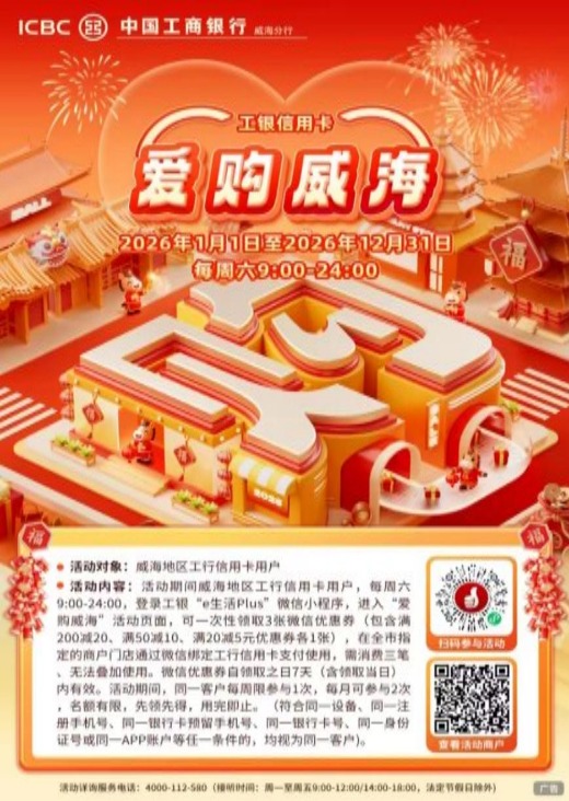 商超采購、酒店住宿、餐飲消費,是城市煙火氣的直接體現(xiàn),也是激發(fā)消費潛力的關(guān)鍵場景。工行威海分行聚焦威海本地消費市場,重磅推出“愛購威?!毙庞每▋?yōu)惠活動,以全年常態(tài)化優(yōu)惠,激活商超酒店餐飲等場景消費活力。